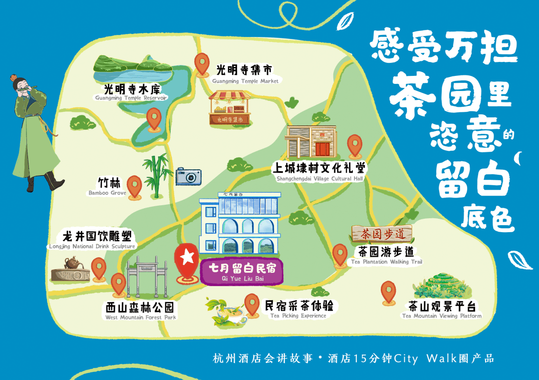 七月留白民宿(观山店)——龙井国饮雕塑——西山森林公园入口——竹林——光明寺水库——光明寺集市——上城埭村文化礼堂——茶园游步道——茶山观景平台——民宿采茶体验