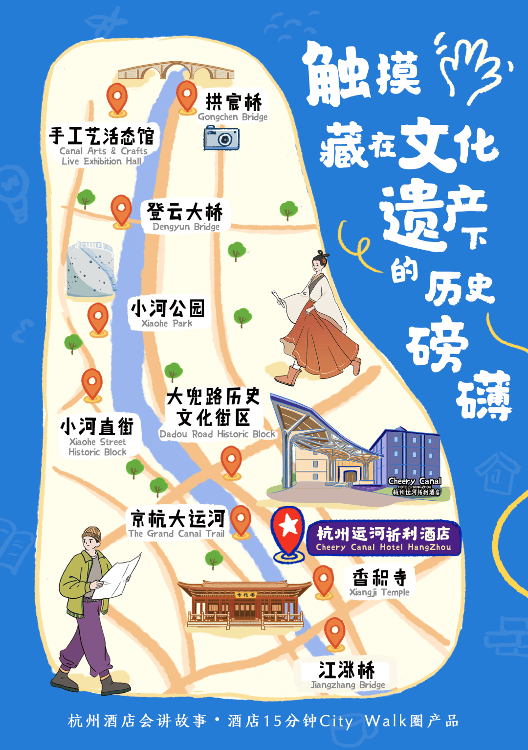 运河黄龙璀丽酒店——香积寺——京杭大运河(香积寺—拱宸桥段)——江涨桥——香积寺东塔,乘公交船(信义坊码头到拱宸桥码头)——拱宸桥——手工艺活态馆——浙江省第一盏电灯——晓风书屋——登云大桥——小河公园——小河直街(推荐解散点位)——大兜路