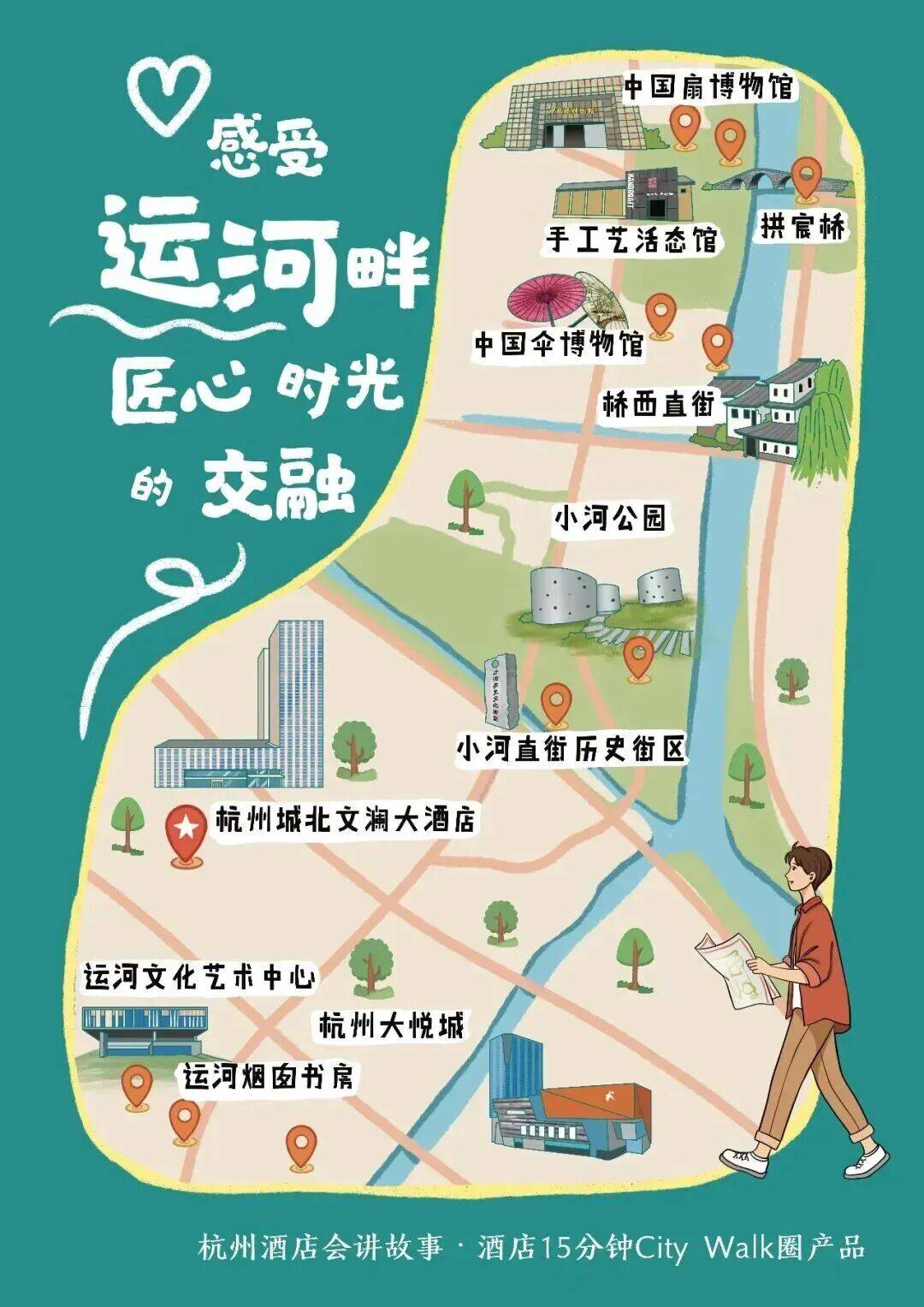 杭州城北文澜大酒店——运河文化艺术中心——运河烟囱书房——杭州大悦城——小河直街历史街区——小河公园——桥西直街——中国伞博物馆——中国扇博物馆——手工艺活态馆——拱宸桥