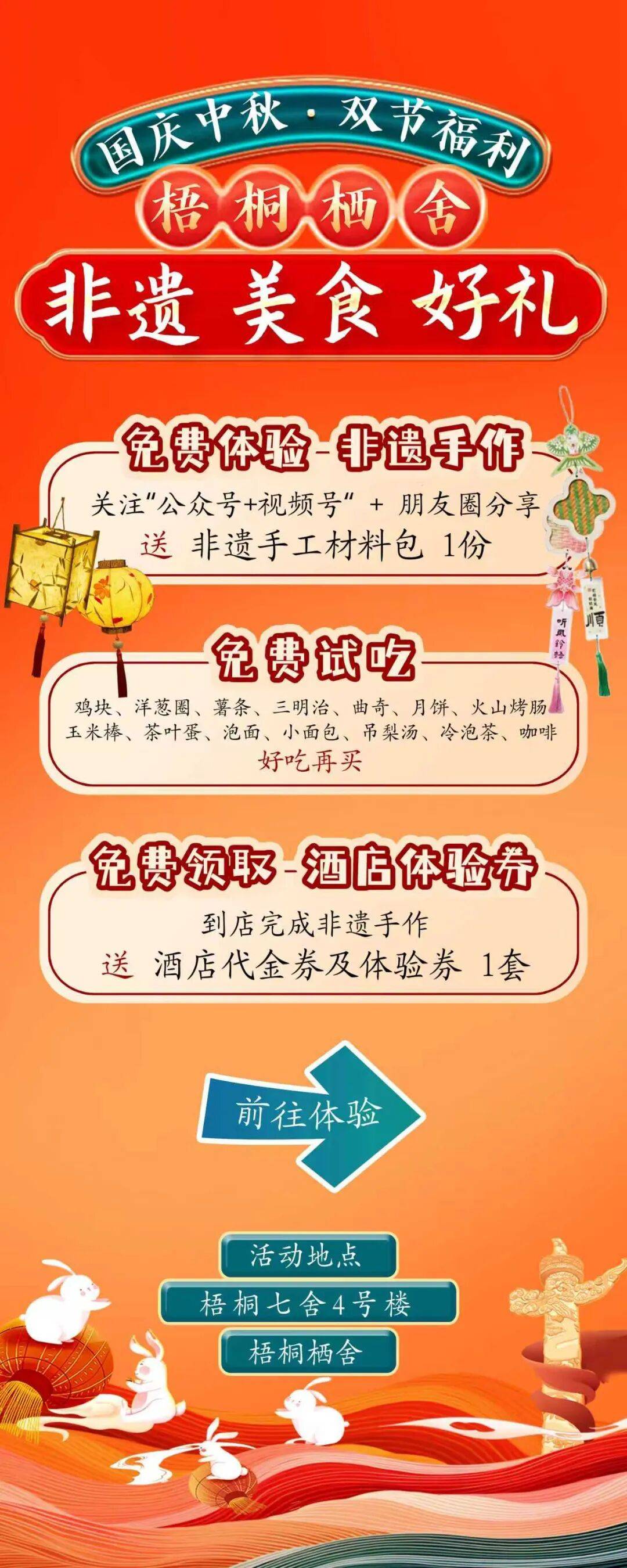这个国庆,临空港会展酒店x武汉梧桐雨内的“梧桐栖舍”,推出“非遗手作赏美食·酒店好礼伴你行”主题双节活动,陪伴大家度过一个充满文化气息与欢乐氛围的假期。